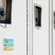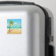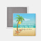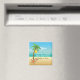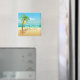 Palmeira e praia tropical de estrelas, Imã salve a data de casamento, apresentando um cenário tropical: uma palmeira com coco numa praia arenosa, com estrelas-do-mar, água azul-oceânica e o céu com sol e nuvens. Excelente para um casamento de praia, tropical. Azul, verde, amarelo, marrom.
