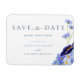 Salve a data com estilo elegante com arte exclusiva de aquarela de flores silvestres pintadas à mão e bela tipografia que é fácil de personalizar com os nomes do noivo e da noiva e a data do casamento. Cartão moderno de "salve a data" de casamento com aquarela de flores silvestres para um casamento boho floral de verão. Flores únicas de prado, incluindo centáureas, papoulas, cosmos e miosótis com folhagem delicada pintadas pela artista Catherine Sweetman em tons de azul centáurea, azul-bege, azul-marinho, roxo e verde. Ideal para o jardim botânico ou casamento ao ar livre na primavera ou no jardim de verão no prado. Encontre itens correspondentes na suíte de casamento moderna de flores silvestres azuis.