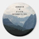 Um ímã de casamento com uma fotografia de belas montanhas, céu nublado, e colinas rolantes cheias de árvores em primeiro plano. esquema de cor azul da cinza.