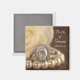 Personalize o elegante Anel Oval Diamond e o Magneto da Praça de Casamento White Rose com os nomes pessoais da noiva e do noivo e a data específica da cerimônia de casamento para criar um presente de casamento personalizado de keepape, a favor da festa ou salvar a data. Estes magnatas nupciais personalizados e elegantes apresentam uma fotografia floral próxima de um anel de noivado de diamante oval, colar de pérolas brancas e flor de rosa branca num fundo de seda marrom.