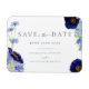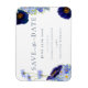 Linda mão elegante pintou aquarela flores silvestres de verão em azul marinho, azul de córnflor, roxo, verde e amarelo casamento salve o cartão de data. Flores incluindo cosmos, flores de milho, papoilas e me esqueçam de nãos com folhagem. Modelo fácil de usar com moderno e elegante roteiro de tipografia. Perfeito para um marinho botânico único, azul, temido no verão ou no casamento da primavera. Arte original única da artista Catherine Sweetman. Material de casamento igual disponível na suíte de casamento azul de flor silvestre moderna.