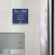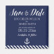 Casamento náutico Salvar os ímanes de data com listras azuis e brancas marinhos, âncora branca e texto branco alterável impresso em fundo azul marinho