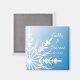 Anuncie seus próximos núpcias de dezembro, janeiro ou fevereiro quando você personalizar o festivo Casamento no inverno Floco de Neve Azul Salve o Magneto Quadrado de Data com os nomes pessoais da noiva, noiva e data da cerimônia de noivos e casamentos. Este elegante ímã de casamento do inverno personalizado apresenta um intricado design de floco de neve branco sobre um fundo de gradiente azul.