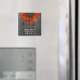 Uma imã salve a data com um girassol laranja no topo sobre um fundo de madeira de casca. Personalize o texto. Procure por convites na Escola Rosa.