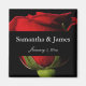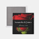 Uma rosa vermelha atrativa de longa data no imã de casamento negro personalizada com seus nomes e data.