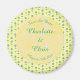 Este incrível salvamento da data que o imã de casamento apresenta um padrão de frutas de abacaxi amarelo tropical com topos verdes e bonito folhas de palma verde-claro. Ideal para um Casamento Termal Tropical ou Verão. Há um círculo amarelo com padrões brancos marmoreados que contém texto personalizável para que você possa personalizar este design.