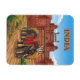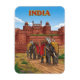 Dois elefantes com cavaleiros são vistos em frente a um grande e histórico forte indiano, banhado à luz do sol sob um céu azul claro.
