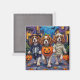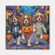 Adorável Cavaleiro Rei Charles Spaniels vestidos com fantasias lúcidas de Halloween carregar baldes de abóbora enquanto trick ou tratando sob o céu iluminado pela lua. Este design festivo põe em evidência a casaco, expressão gentil, e a personalidade afetuosa da raça, capturando perfeitamente a atmosfera assustadora e divertida da noite de Halloween. Uma celebração encantadora para amantes de cães e fãs do Halloween.