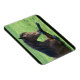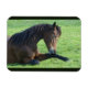Magneta com uma bela fotografia, com um belo cavalo marrom deitado na grama, com aparência pacífica e contente.