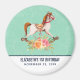 Ímãs de aniversário personalizados para salvar a data de aniversário ou lembrancinhas de festa, etc... Projetados com uma imagem encantadora e fantasiosa de um cavalo mecedor antigo com um lindo buquê floral em rosa e amarelo. O fundo é um padrão de damasco xadrez verde claro desgastado.