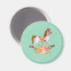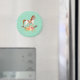 Um ímã com uma imagem charmosa e fantasiosa de um cavalo de balanço antiquado com um bonito buquê floral a rosa e amarelo. O fundo é uma cor damasco verde-clara.