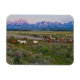 Esta foto mostra uma manada de cavalos correndo em frente à serra do Grande Teton na zona rural de Wyoming durante a luz da manhã.