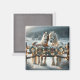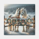 Dois cavalos, um cavalo marrom e um cavalo branco parado atrás de uma cerca acendeu com luzes de Natal e coroas em um dia de neve.
