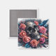 Trabalho de arte insípida com um crânio lindamente detalhado, adorado com rosas, penas e um pássaro azul vibrante, simbolizando o contraste entre vida, morte, beleza e transformação em um arranjo artístico elegante.
