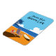 Cena de praia com Surfer, cadeira e laranja brilhante e azul como as cores dominantes. A cena foi projetada como um olhar para trás para a impressão da era 70. Que cena de praia brilhante e colorida em um saco de impressão. O ditado "Mente Feliz, Vida Feliz" é completamente personalizável e pode ser mudado para qualquer coisa que você gostaria ou eliminado juntos. Um ímã de bom tamanho para preencher um espaço vazio em um armário de arquivos de metal ou preparar sua geladeira.
