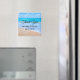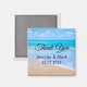 Um ímã de agradecimento de casamento com uma fotografia de uma cena de oceano azul claro com ondas suaves ao longo de uma costa e areia marrom suave. Um céu azul com nuvens fofas ao longe. Paisagem marítima tropical serena e idílica.