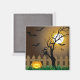 Uma ilustração do Dia das Bruxas com uma árvore assustadora com um gato, morcegos assustadores voando, uma lua de cheio brilhante e uma abóbora assustadora.