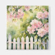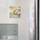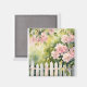 Flores cor-de-rosa crescem em torno de uma cerca branca de picete, curvada, neste ímã. Doce e romântico, e muito bonito! Perfeito para quem ama flores e jardinagem.