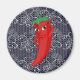 Um personagem de desenho animado de pimenta vermelha e quente. Design original com padrão de renda branca no fundo.