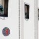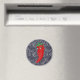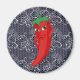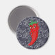 Um personagem de desenho animado de pimenta vermelha e quente. Desenho original com padrão de renda branca no fundo. Ímãs personalizados. Ideia de decoração para todas as festas que você possa imaginar! Ideia de presente para amantes de comida apimentada.