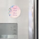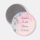 Um ímã comemorativo feminino e sofisticado perfeito para chá de noiva ou de bebê. Uma ilustração em aquarela suave e delicada de um arranjo floral com flores silvestres rosa e azuis em um fundo que lembra pergaminho de pêssego, dando a este design um charme vintage. Flores azuis decoram a borda do design enquanto as flores rosa desvanecem ao fundo para um efeito suave e delicado.