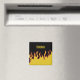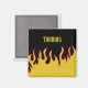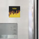 Adicione um nome ou mensagem personalizada para criar um ímã de geladeira com uma aparência dura e maníaca. Este ímã apresenta uma ilustração das chamas em amarelo e vermelho contra fundo preto.