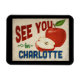 Um charmoso ímã de geladeira de viagens vintage da Carolina do Norte com uma adorável maçã vermelha, junto com um texto divertido no estilo retrô que diz, "Veja você em Charlotte"
