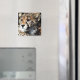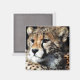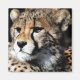 Magneta quadrada com uma imagem da cabeça de um lindo guepardo. O guepardo é um felino grande (família Felidae, subfamília Felinae) que habita a maior parte da África e partes do Irã. Encontra-se classificado como vulnerável, enfrentando várias ameaças, incluindo a concorrência e a predação por outros carnívoros, uma piscina genética de baixa variabilidade e perseguição pela humanidade.