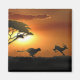 A silhueta de um guepardo perseguindo uma gazela. O pôr do sol escurece atrás deles.