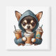Um adorável chihuahua vestindo uma camisa de suor encapuzada cercada por xícaras de café e bebidas deliciosas. Uma representação artística e caprichosa ideal para temas de relaxamento, cultura cafeeira e estilo de vida fofo para animais.