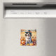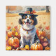 Uma pintura em forma de aquarela de um cão alegre sentado em meio a uma pilha de folhas vibrantes de queda, cercado por pequenas abóboras e bolotas espalhadas. O cachorro veste um chapéu de peregrino e fede de alegria, capturando o espírito da Ação de Graças. No fundo, campos de colheita suaves e árvores abrigadas em ouro criam um ambiente rural pacífico. Texturas gentis e tons de outono aquecidos dão à cena uma sensação acolhedora e nostálgica de celebrar a beleza da estação.