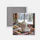 Um belo ímã de Natal sazonal com uma ilustração de chocolate quente, biscoitos de açúcar, fatias de laranja secas, bastões de canela e uma árvore de Natal fora de uma janela de inverno.