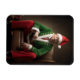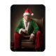 Foto de Donald Trump sentado em uma cadeira de couro marrom vestindo uma fantasia de elfo de Natal