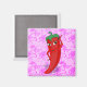 Um personagem de desenho animado de pimenta vermelha e quente. Design original com padrão de renda rosa no fundo. Ímãs personalizados. Para todas as festas que você possa imaginar! Ideia de presente para amantes de comida apimentada.