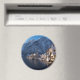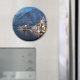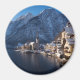 Imagem redonda com a cidade de Hallstatt coberta de neve ao lago do lago Hallstätter See, com montanhas Alps ao fundo, à luz do nascer do sol, numa paisagem de inverno na Áustria.