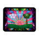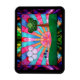 Um design digital de vidro colado no estilo Art Deco popular no século 20. O motif de explosão solar de uso corrente é central, ascensão atrás de uma paisagem verde balanceada por uma árvore de um lado e nuvens e flores do outro. Formas geométricas são usadas para enfatizar a simetria da cena, com a árvore e nuvens feitas de círculos sobrepostos. Vários fractais de cor clara dão textura de "vidro" e interesse. A cena é enquadrada em ferro preto e blocos em forma de diamante fosco com padrões fractais escuros mas vívidos.