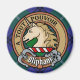Crachá da crista Clã Oliphant cercado por uma correia e fivela sobre fundo tartano. Custom Text.