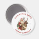 Um ímã com uma ilustração de Natal divertida. Papai Noel em seu terno vermelho tradicional cavalgando uma rena grande e picada decorada com o Holly. Uma árvore de Natal nas costas.