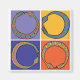 Quatro cobras azuis mordem seus contos nesses quadrados de azul, vermelho e laranja.