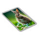 Este ímã mostra um coelho querido marrom e branco apreciando o sol da primavera à medida que ela senta na grama com ovos doces coloridos perto de seus pés.