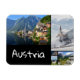 Imã de geladeira retangular de viagem com uma colagem composta por várias paisagens na Áustria, como Hallstatt, Seefeld e as montanhas dos Alpes, dentro de um quadro negro e com o texto "Áustria".