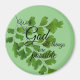 Imagem redonda de 3 polegadas "Com Deus Todas as Coisas São Possíveis" sobre fundo verde