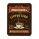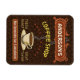 Esta imã de geladeira retangular com o tema do café é para qualquer pessoa que administre seu próprio compro de café ou tenha um tema de café na decoração da cozinha da sua casa. Feito em castanho, laranja, bege e amarelo, este design de inspiração/espresso apresenta uma xícara em um disco, duas banners de texto personalizados e as palavras "Compro de café / Floresta fresca / Sabor de Excelente" em amarelo. A caneca está a vapor e a faixa de cima tem espirais que imitam a fumaça. Tudo repousa sobre um fundo escuro de grãos de café. Use as modelos para adicionar seu nome facilmente. Você também pode mudar o slogan inferior se quiser, que atualmente lê, "Sem Motivos para Reclamação." Se precisar redimensionar o texto para o ajustado, clique em "Personalizar." Pegue uma xícara de Joe e admire seu próprio e personalizado ímã flexível para café.
