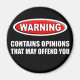 Todos têm uma opinião sobre a maioria das coisas. As chances são de uma de suas opiniões ofender alguém em algum lugar, então por que não avisá-los com esta design? A palavra "aviso" encontra-se num botão vermelho, com o texto abaixo a dizer "contém opiniões que podem ofendê-lo".