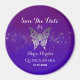 Moderno, elegante, exclusivo, borboleta falsa prateada brilhante em combinação com um fundo azul real roxo encantador. Ímã de convite de save the date para festa de Quinceanera chic, caprichoso e atemporal.