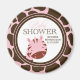 O adesivo de favoritos redondo de chá de fraldas desta na moda tem um padrão de girafa castanho-rosa e cor-de-rosa suave e escuro com uma estrutura marrom, rosa e branca no meio. No fundo, há uma cabeça de zebra fofa a espreitar à esquina. No topo, o Bebê é escrito em uma fonte cursiva de tendência bronzeada com chá escrito em um marrom escuro abaixo. À esquerda, você pode personalizar isso com o nome da mamãe a ser e a data do chá de fraldas. Alguns design são de STOCKBERRY STUDIO.
