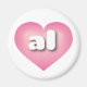 Este ímã contém um coração cor-de-rosa com um centro lavado em branco contendo as letras maiúsculas e maiúsculas negros, brancas, arredondadas, uma abreviação lúdica para o Alabama, o estado dos amarelos. Roll Tide!