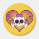 Crânio feminino bonito e bósforos com chamas colocadas sobre um coração em tons de amarelo e rosa.