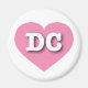 Este ímã apresenta um coração cor-de-rosa vibrante contendo as letras maiúsculas, brancas e em negrito DC, a abreviação para o Distrito de Colúmbia.