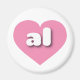 Este ímã contém um coração cor-de-rosa tranquilo e legal contendo as letras maiúsculas e maiúsculas negros, brancas, arredondadas, uma abreviação lúdica para o Alabama, o estado dos amarelos. Roll Tide!